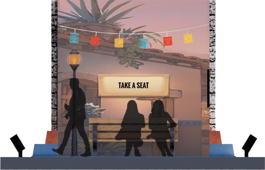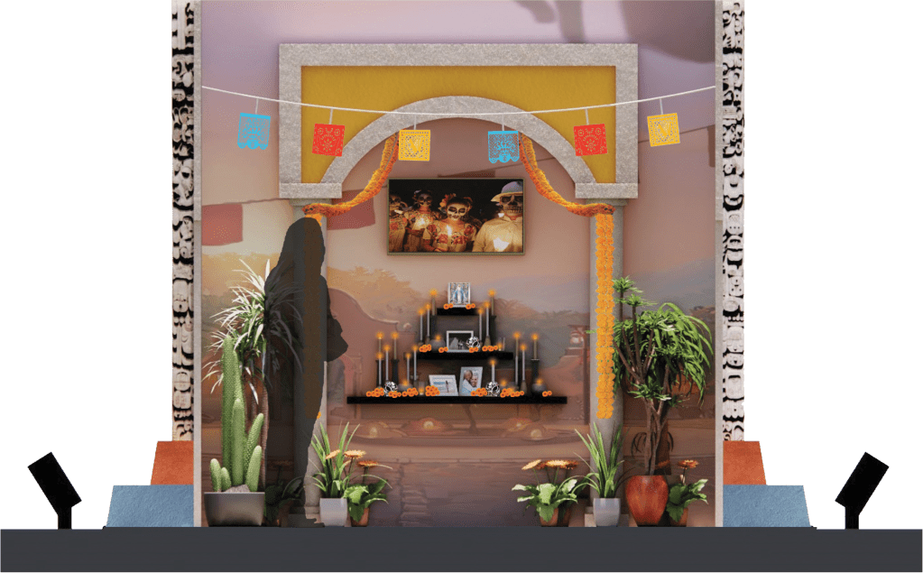 The exterior of the kiosk embraces the rich history of Mexico City, formerly established as the Aztec civilization of Tenochtitlan. Unique architectural forms reference the prominent temples where ritualistic and ceremonial events took place and where the Aztecs connected with their gods. Upon entering, guests are transported to a modern-day Mexican village, nestled in the outskirts of the city. Interactive elements, such as a decorated ‘ofrenda’ inform visitors about the Dia de los Muertos celebration that is an important tradition in Mexican culture.