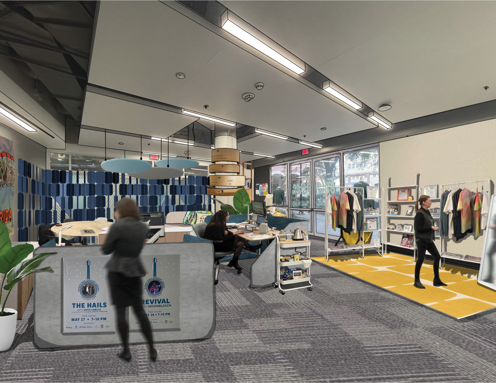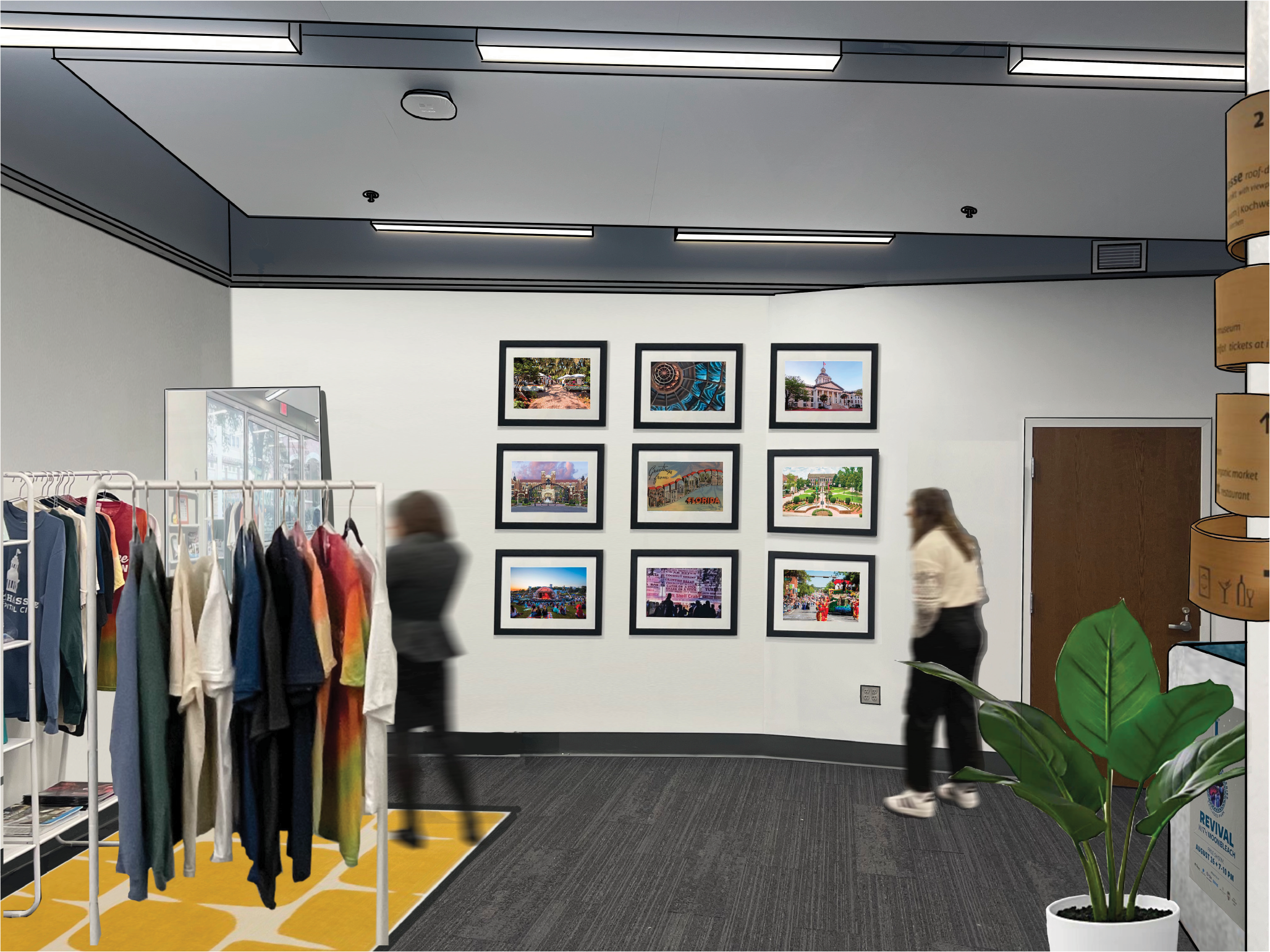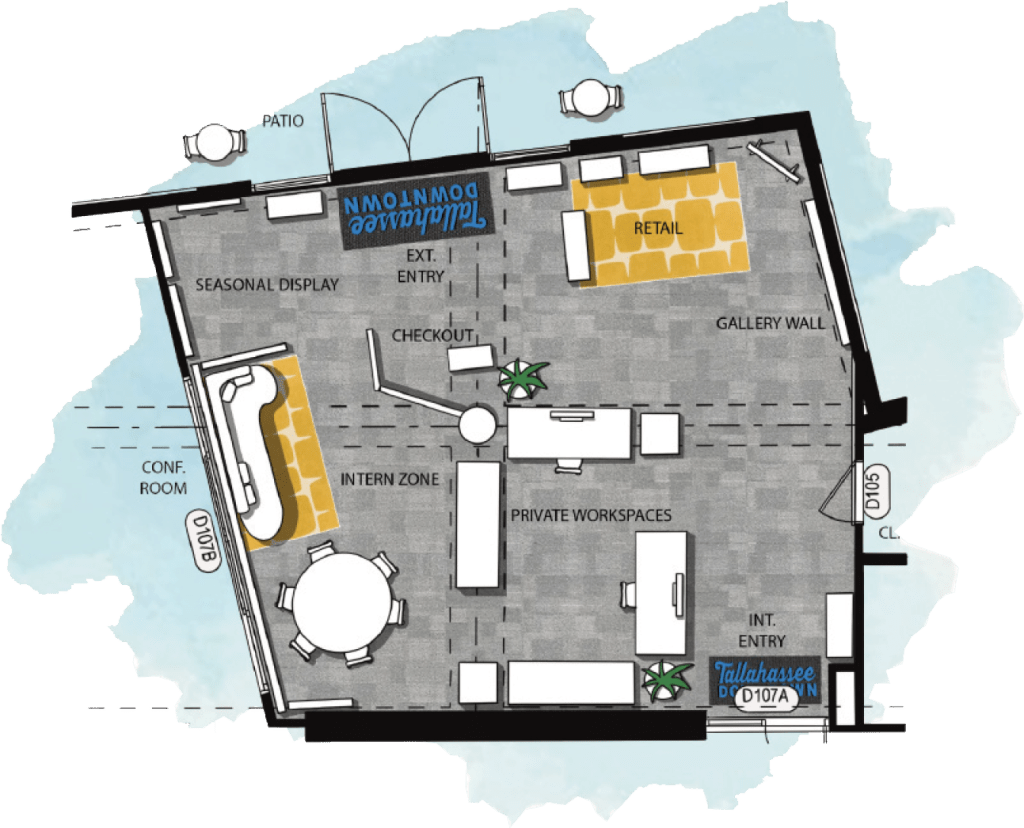 The design is inspired by the notion of third place & is integral to the client’s mission of placemaking and expanding local opportunities for leisure & recreation. The design will support this concept by creating emphasis on the retail experience for visitors and featuring a local art program & creative wayfinding strategies that reflect the character of downtown Tallahassee. The selection of materials & furnishings will establish a sense of place through prominent branding & will build on existing forms within the space to create a more dynamic and purposeful environment.