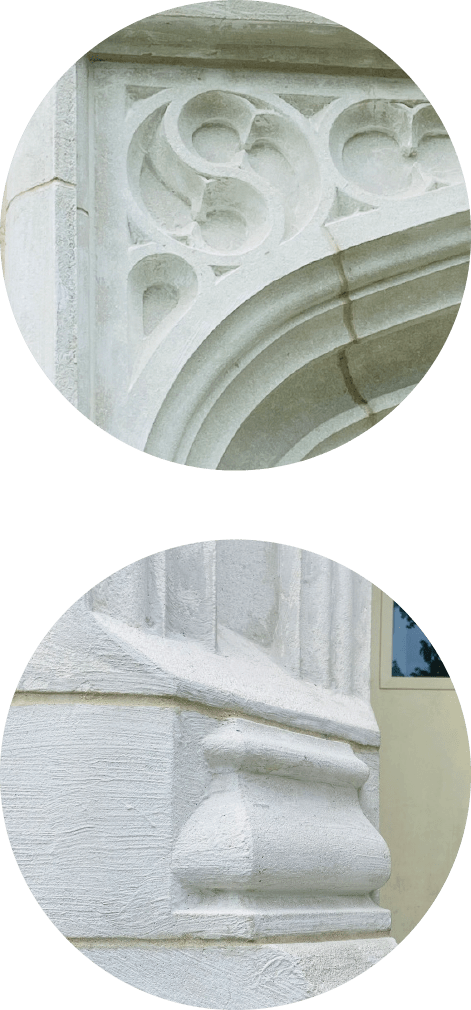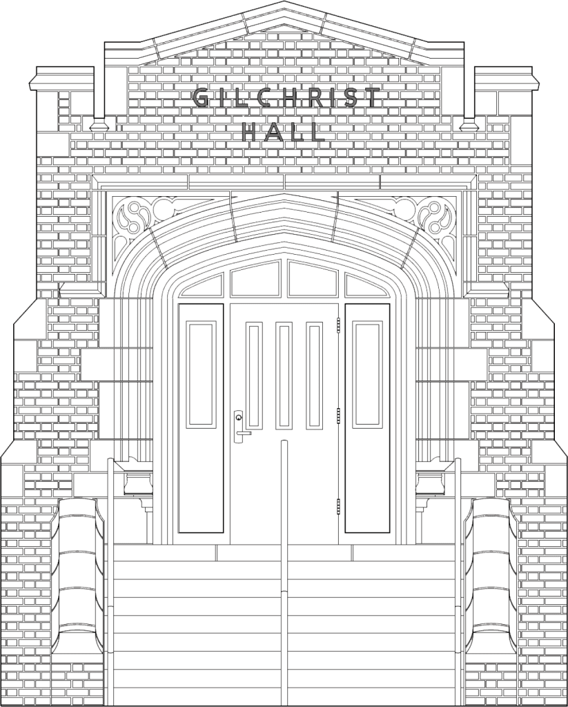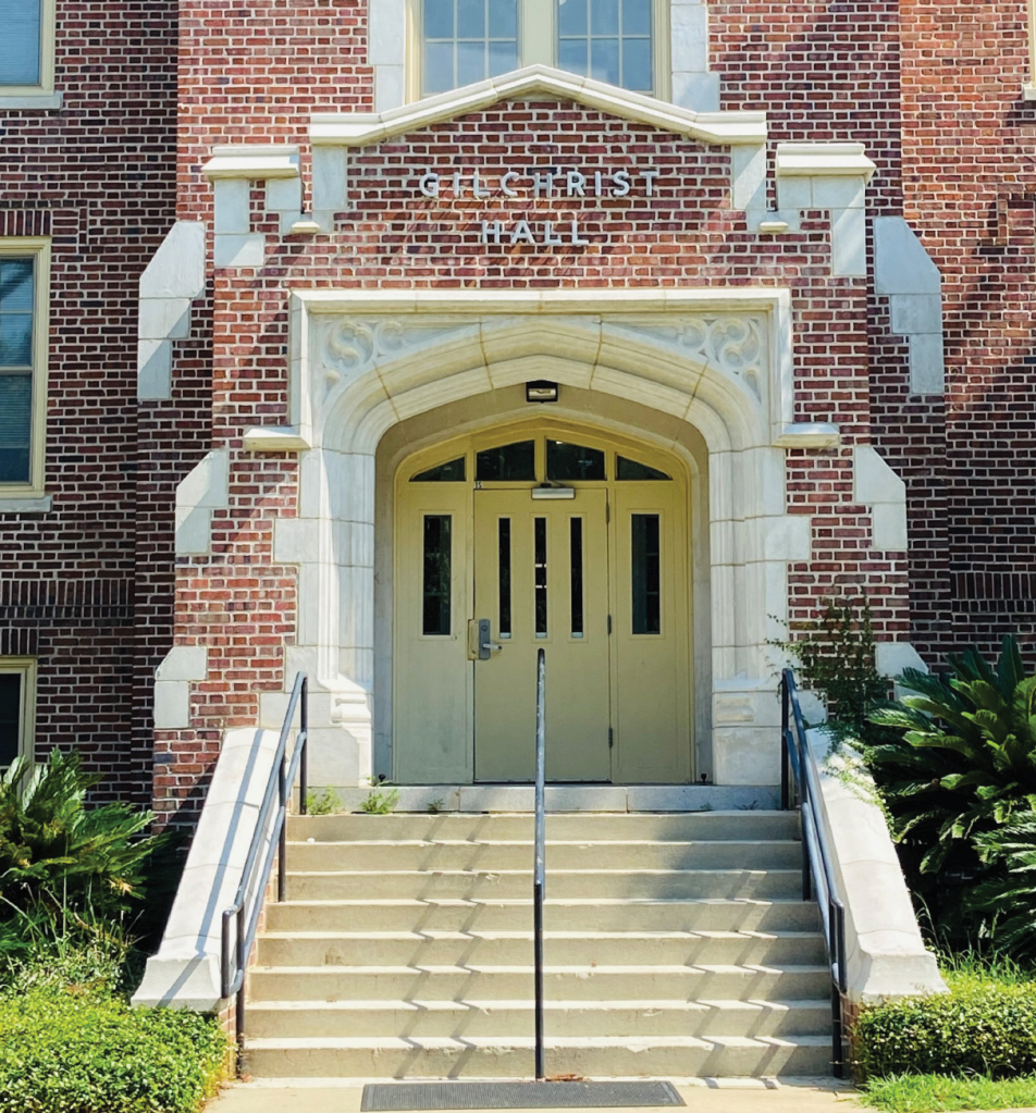 Gilchrist Hall was originally constructed in 1925 and has served as a dormitory throughout its history. The building is characteristic of the Jacobean Revival period, a dominant architectural style on the Florida State University campus. The building’s primary facade features a gently curved Jacobean stone arch on a raised platform, along with other stone details above the entryway and a Flemish bond brick pattern.